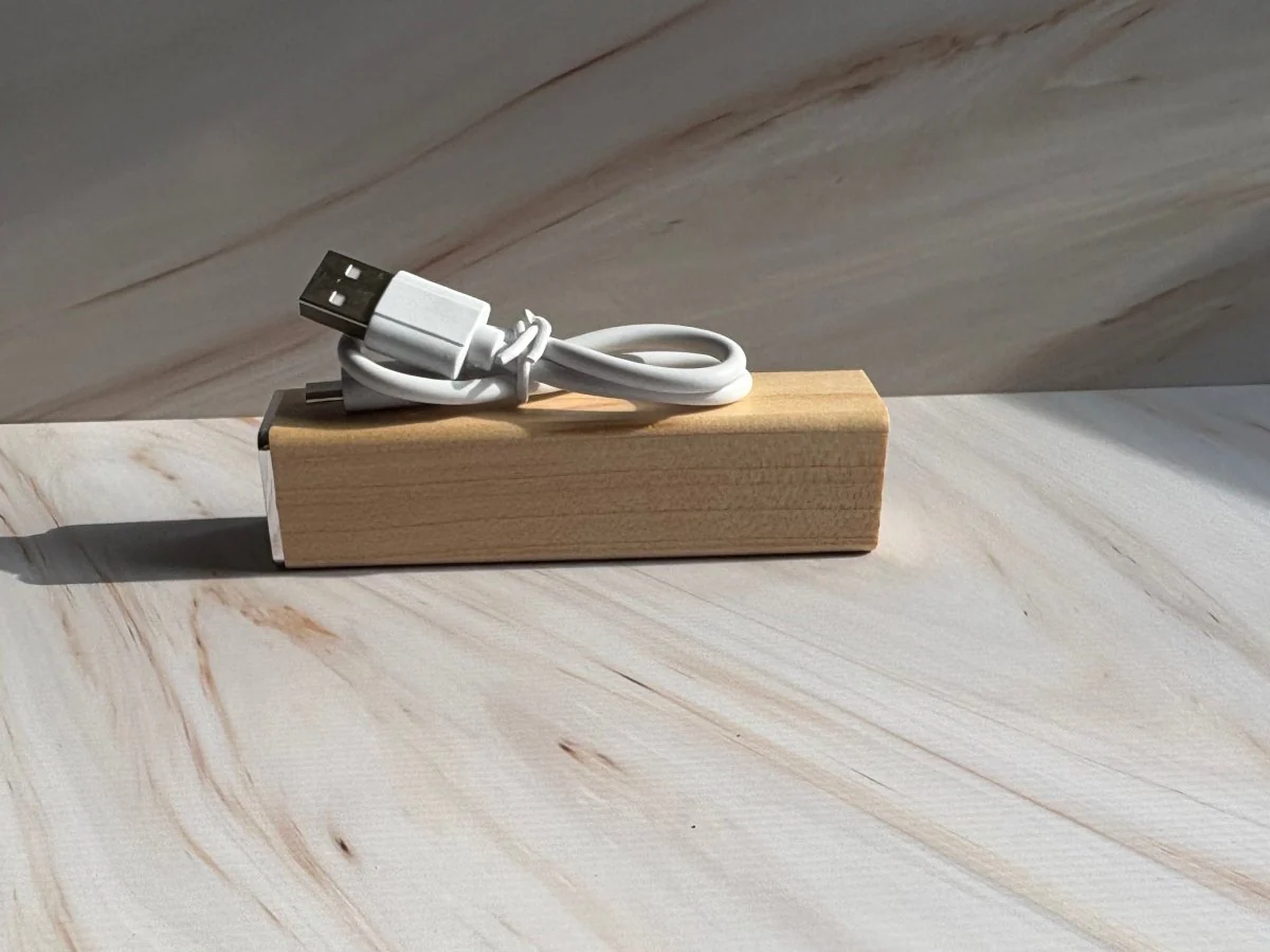 The Square Tube Maple Power Bank Charger is a compact 2200mAh backup battery wrapped in a minimalist maple wood casing. It delivers extra power to your phone and small devices in a sleek, travel-sized design.