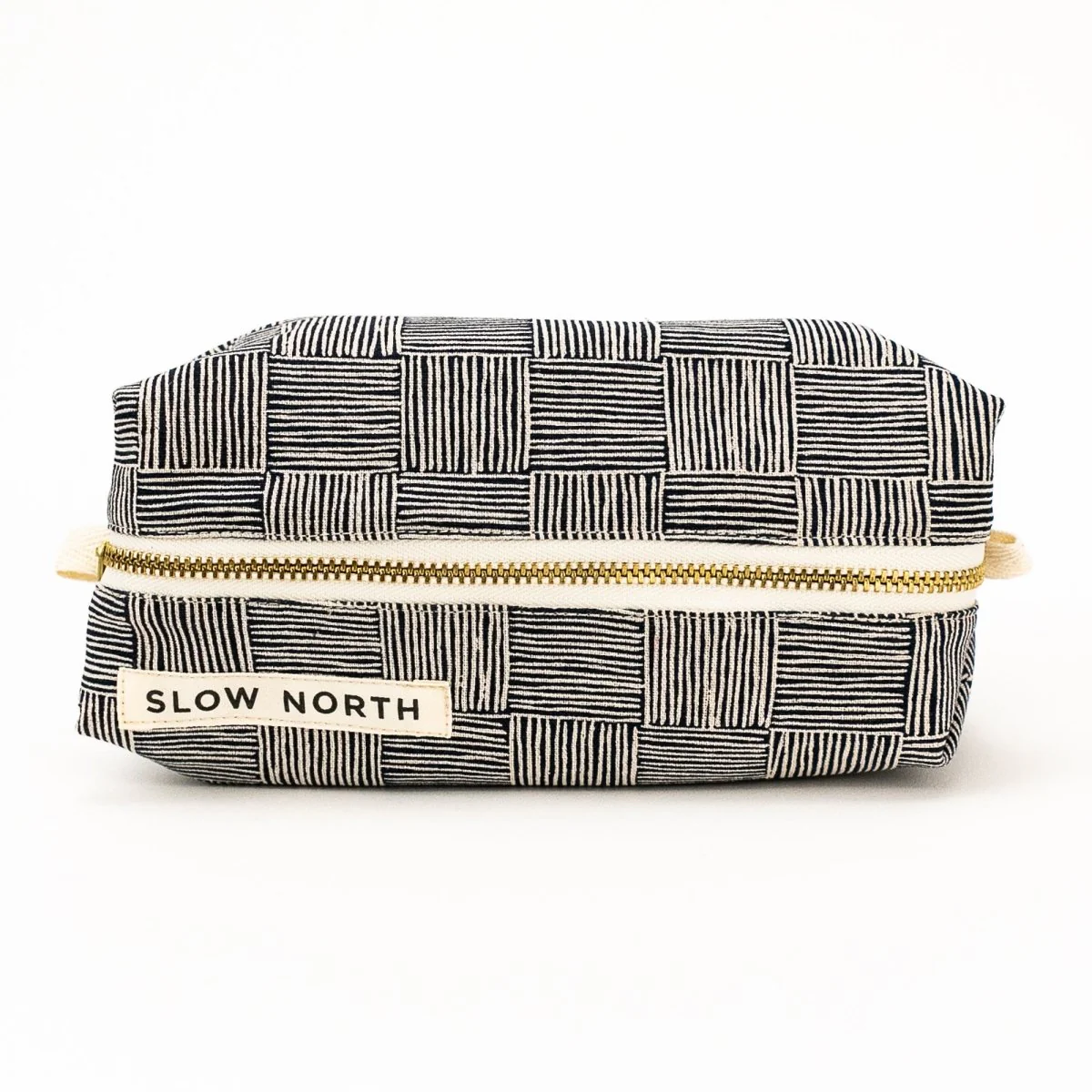 A self-standing, structured travel pouch lined with heavy canvas and finished with an easy-access YKK brass zipper.